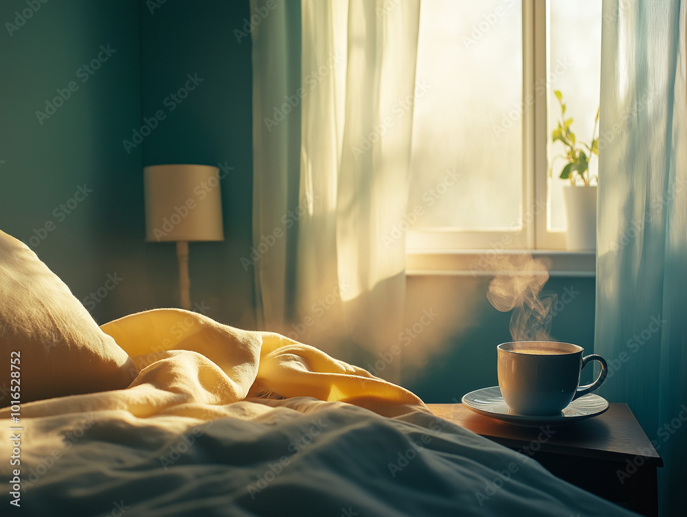 Fototapeta do SPA - Słoneczny poranek z kawą w sypialni. #1016528752
