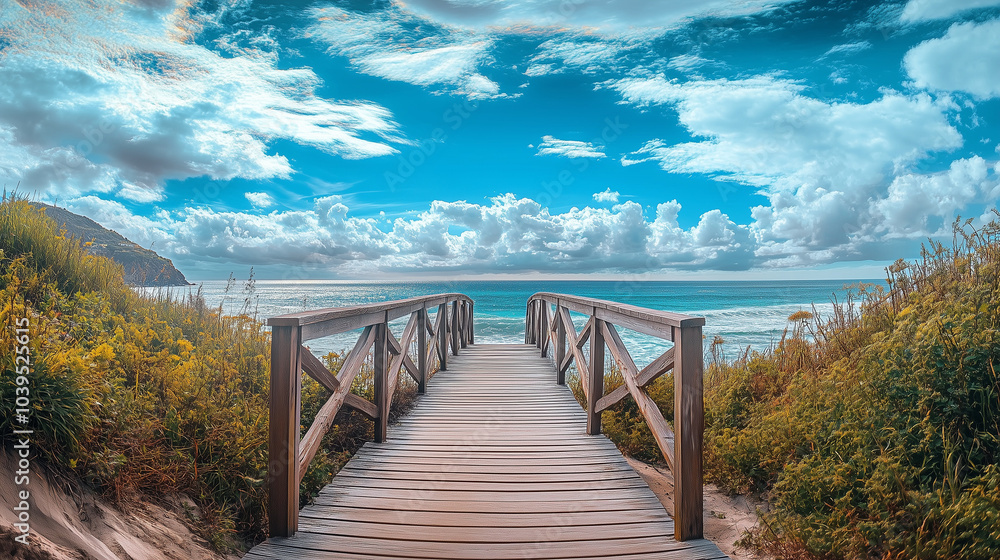 Fototapeta do SPA - Panoramiczny widok przedstawia malowniczy mostek, który prowadzi do piaszczystej plaży. #1039525615