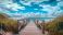 • Panoramiczny widok przedstawia malowniczy mostek, który prowadzi do piaszczystej plaży.