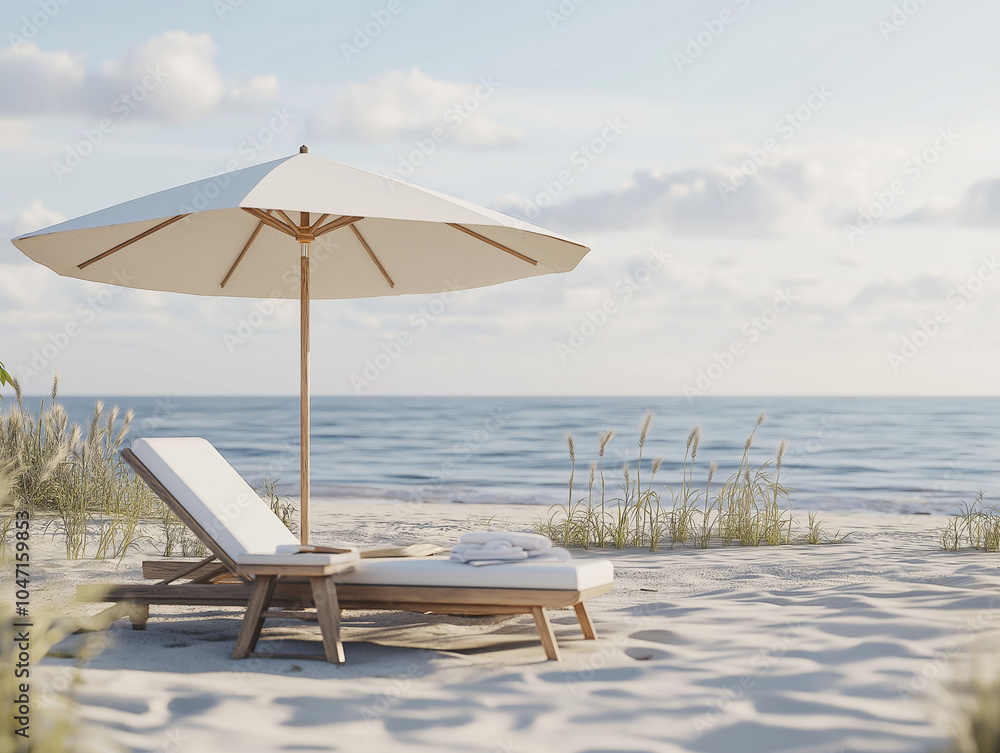 Fototapeta do SPA - Leżak i parasol na piaszczystej słonecznej plaży #1047159853