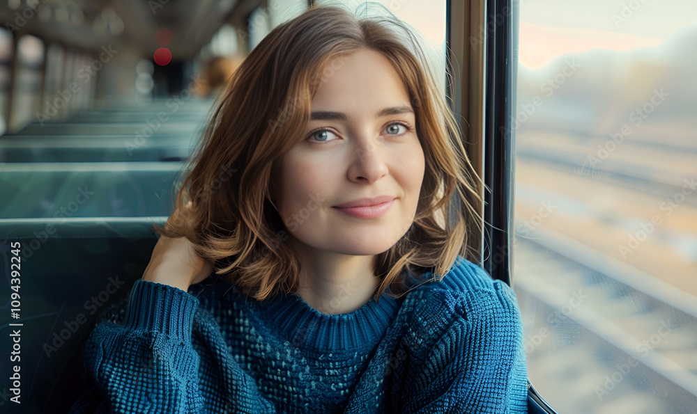 Fototapeta do SPA - Młoda kobieta w niebieskim swetrze, siedząca przy oknie w pociągu i uśmiechająca się subtelnie. #1094392245