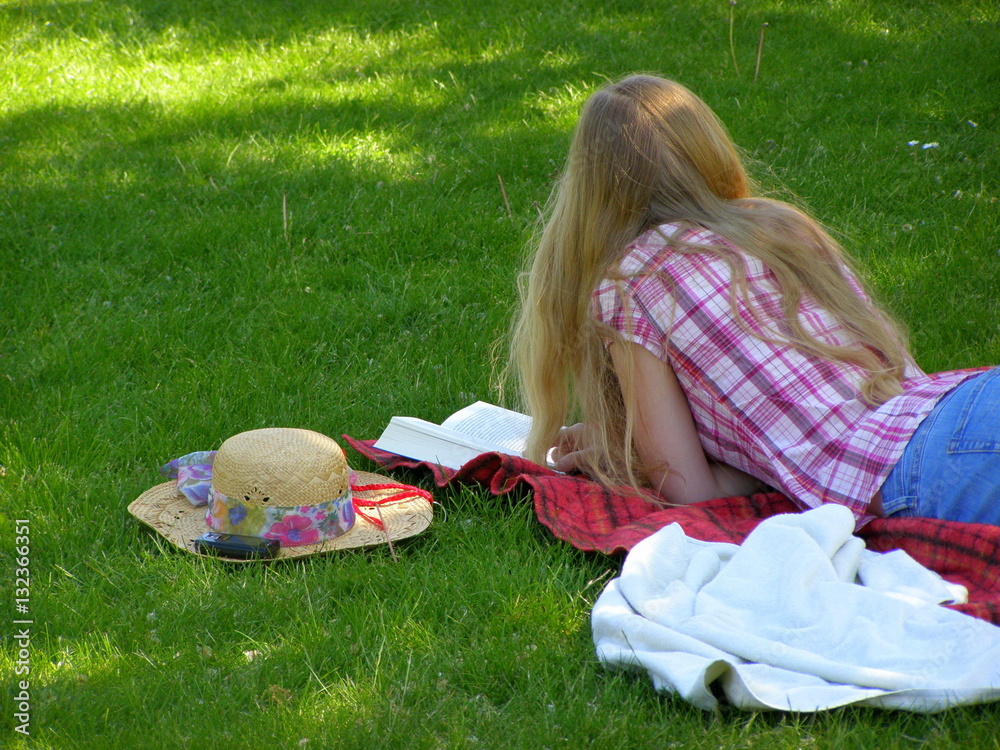 Fototapeta do SPA - Kobieta czytająca książkę na trawie #132366351