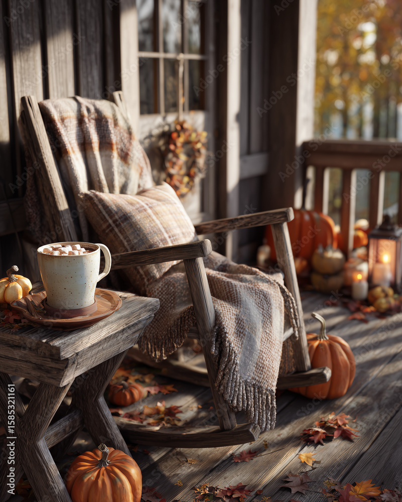 Fototapeta do SPA - Ganek ozdobiony na jesień – dynie, liście, wrzosy i koce tworzą przytulną, sezonową atmosferę.... #1585321161