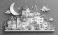 • PASTELOWA NOCNA ILUSTRACJA NOWOCZESNYCH BUDYNKÓW Z ROŚLINNOŚCIĄ