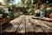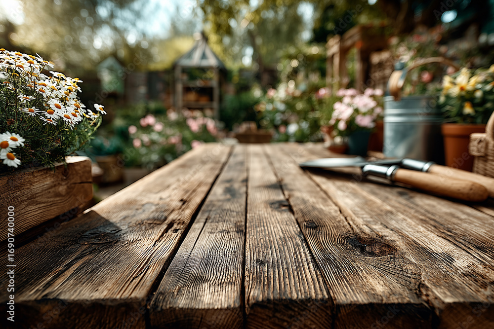 • Drewniany, stary stół z narzędziami ogrodowymi, na którym stoi doniczka z białymi kwiatami. Tło jest rozmyte, co podkreśla głębię obrazu, i przedstawia ogród z roślinami i domkiem.
