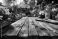Fototapeta do SPA - Drewniany, stary stół z narzędziami ogrodowymi, na którym stoi doniczka z białymi kwiatami. Tło... #1690740000