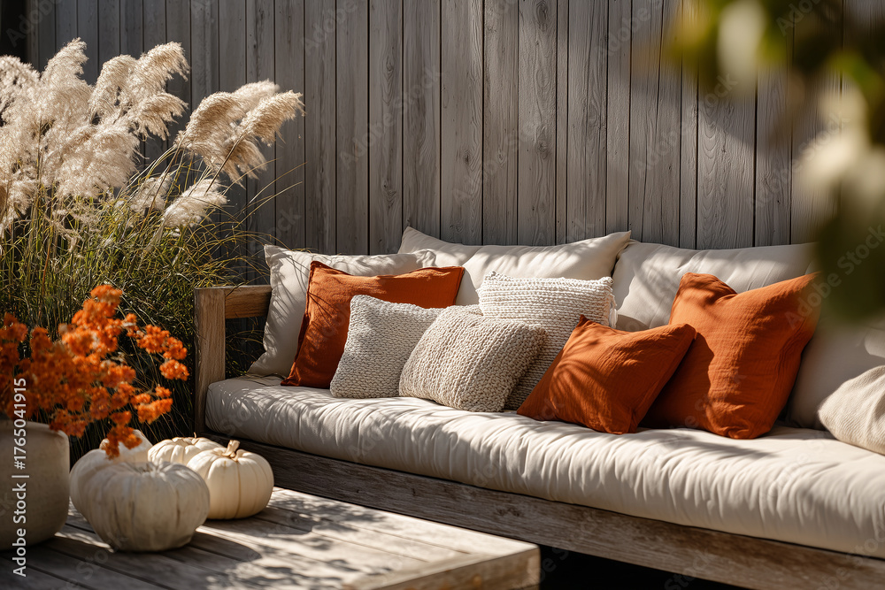 Fototapeta do SPA - Jesienny, przytulny taras: beżowa sofa z pomarańczowymi i kremowymi poduszkami, dynie, trawa... #1765041915