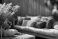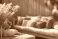 • Jesienny, przytulny taras: beżowa sofa z pomarańczowymi i kremowymi poduszkami, dynie, trawa pampasowa i drewniana ściana.