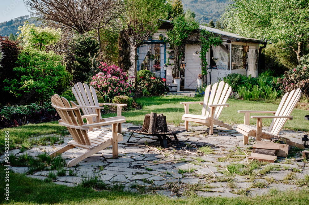 Fototapeta do SPA - Miejsce na ognisko w ogrodzie z altanką ogrodową w tle. Meble ogrodowe , strefa wypoczynku #504352856