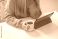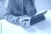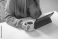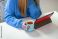 • Kobieta pijąca herbatę, siedząca przy stole przed ekranem tableta
