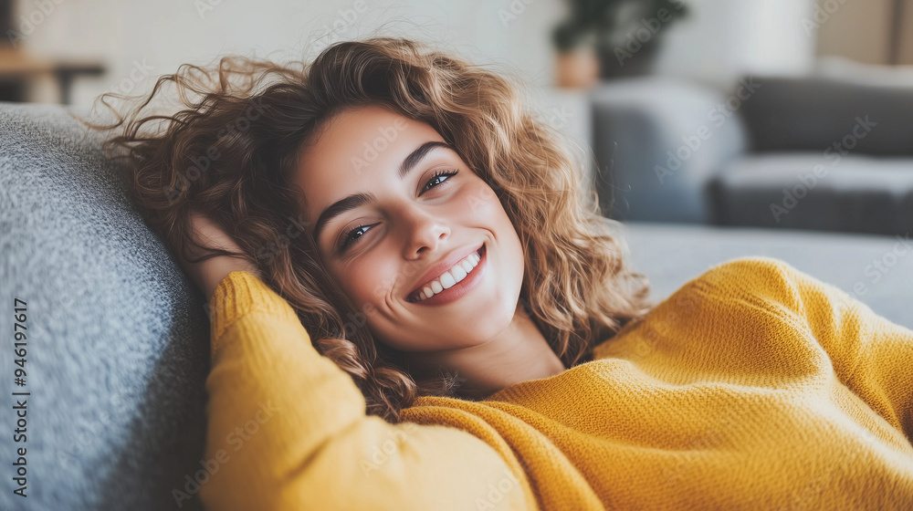 Fototapeta do SPA - Uśmiechnięta kobieta odpoczywająca na kanapie, cieszy się dniem wolnym w przytulnym domu. #946197617