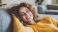 • Uśmiechnięta kobieta odpoczywająca na kanapie, cieszy się dniem wolnym w przytulnym domu.