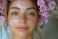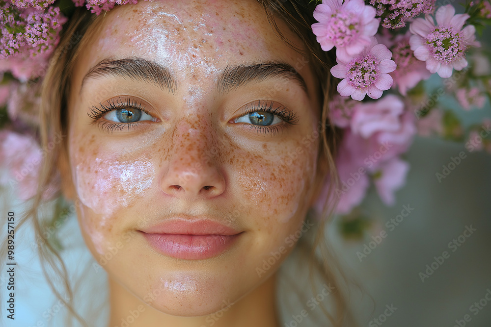 Fototapeta do SPA - Portret pięknej kobiety w spa. Kobieta z kremem na twarzy i wianku z różowych kwiatów na głowie. #989257150