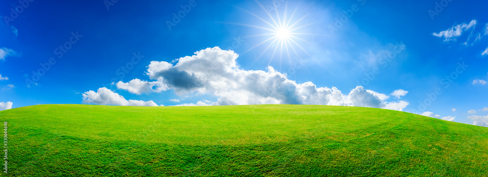 Fototapeta do Gabinetu Lekarskiego - Green grass field and blue sky with white clouds,panoramic view. #330644648