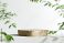 • Wooden product display podium with blurred nature leaves background. 3D rendering
