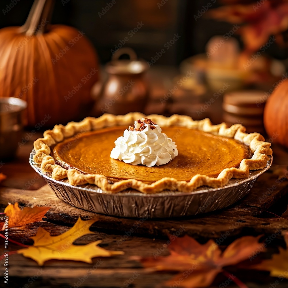 • A delicious pumpkin pie topped with whipped cream, surrounded by autumn leaves and pumpkins, creating a warm, seasonal ambiance.