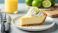 • Key lime pie slice with whipped cream, lime wedge, and a fresh, zesty background.