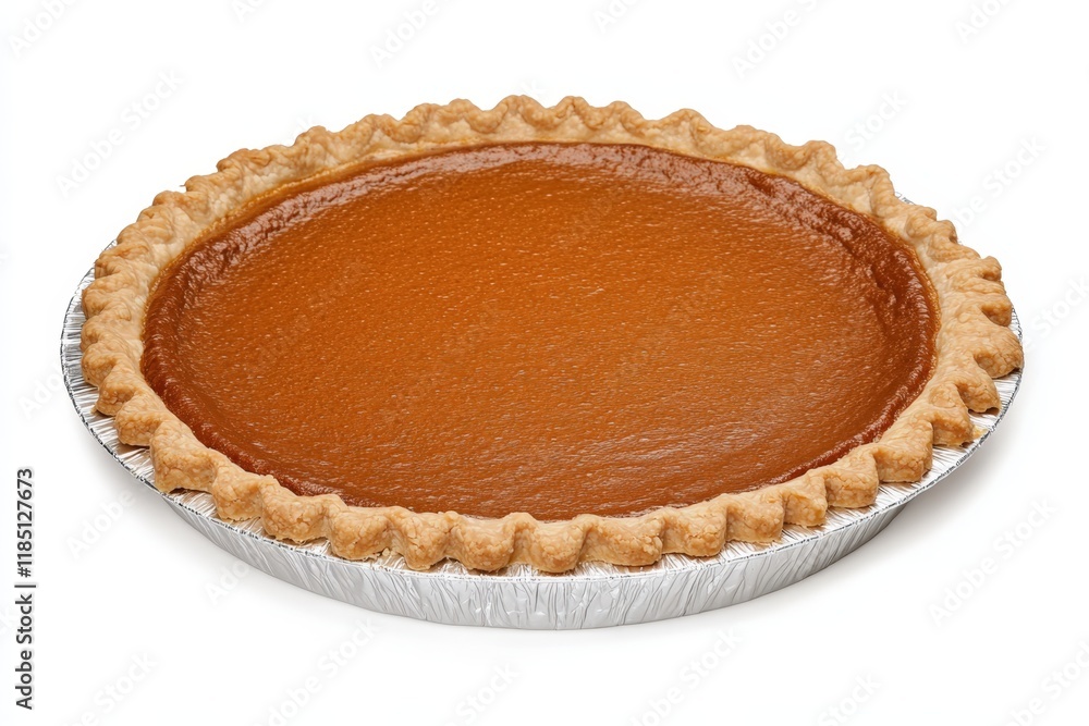 • Baked pie in tin, pumpkin filling, food photography, isolated, suitable for ads.
