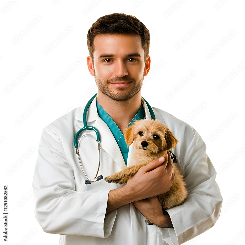• Caring veterinarian holding a small dog in his arms. Gentle, friendly, and professional animal doctor.