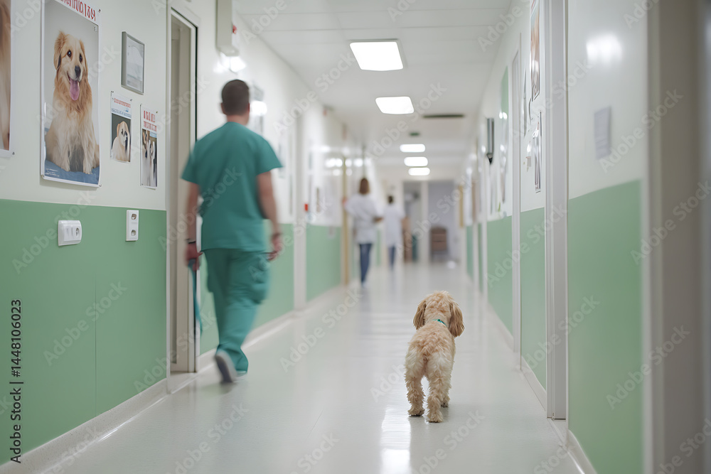 Fototapeta do Gabinetu Weterynaryjnego - Dog in Clinic Hallway: A small dog walks down a hospital corridor, followed by a staff member, in... #1448106023