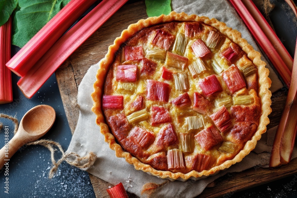 • Tasty rhubarb pie with custard set against a rustic backdrop