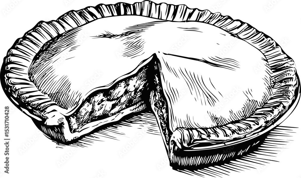 • Black and white sketch of a sliced pie with detailed crust and filling. Vector illustration