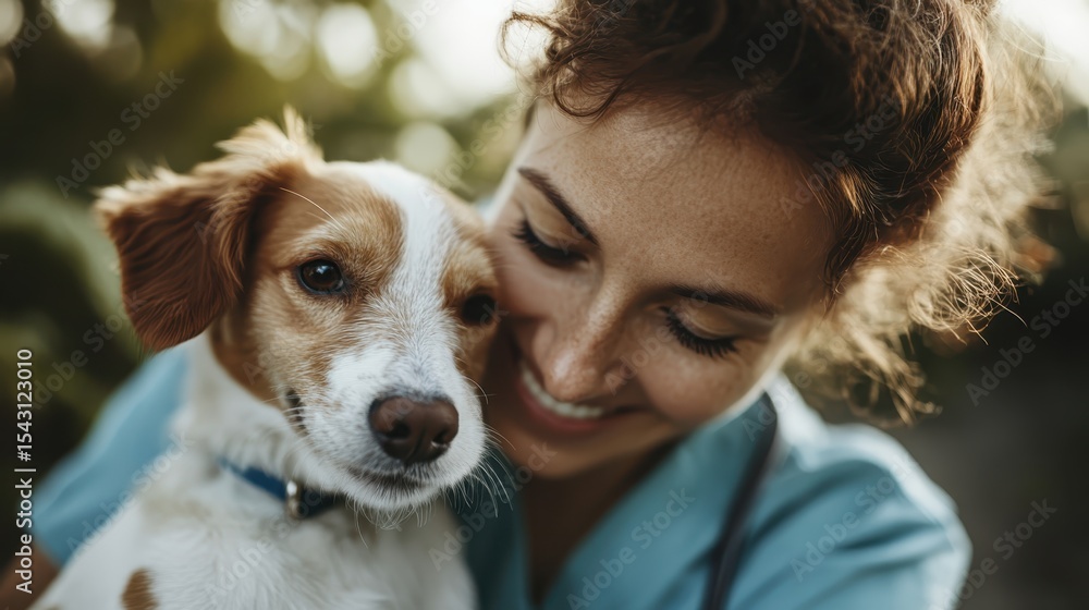 Fototapeta do Gabinetu Weterynaryjnego - A joyful woman embraces her pet dog in a serene outdoor environment, showcasing the bond between... #1543123010