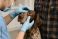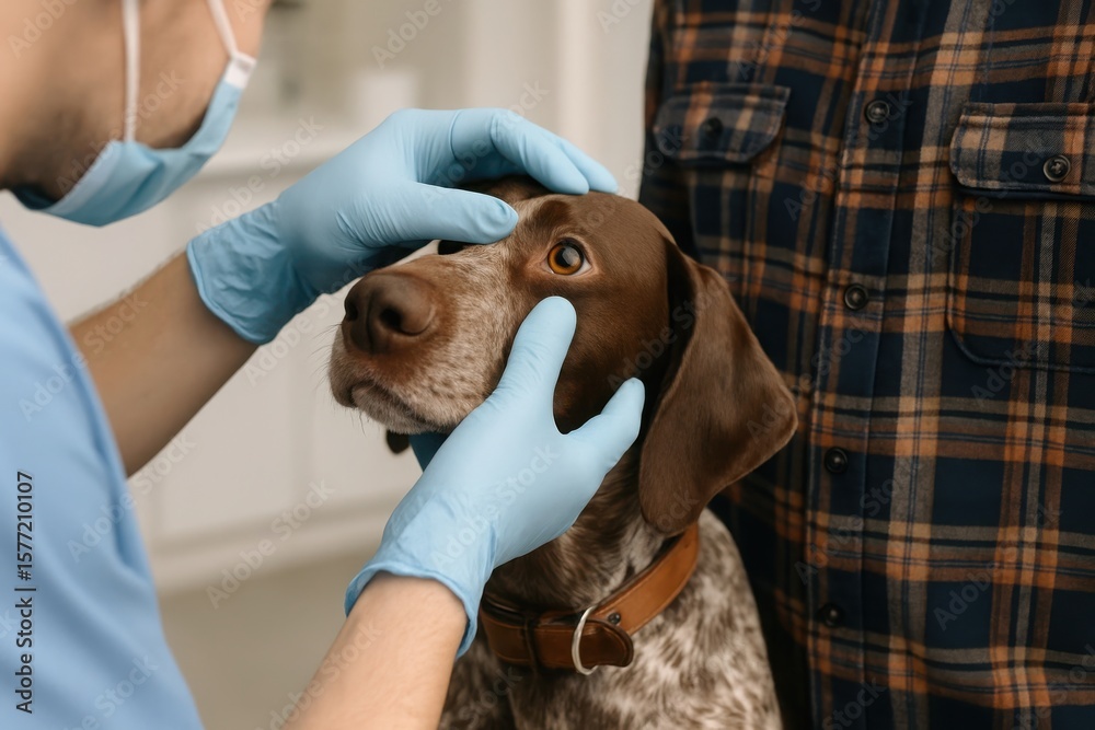 • Veterinarian wearing gloves and mask examines a dog s eye during a checkup