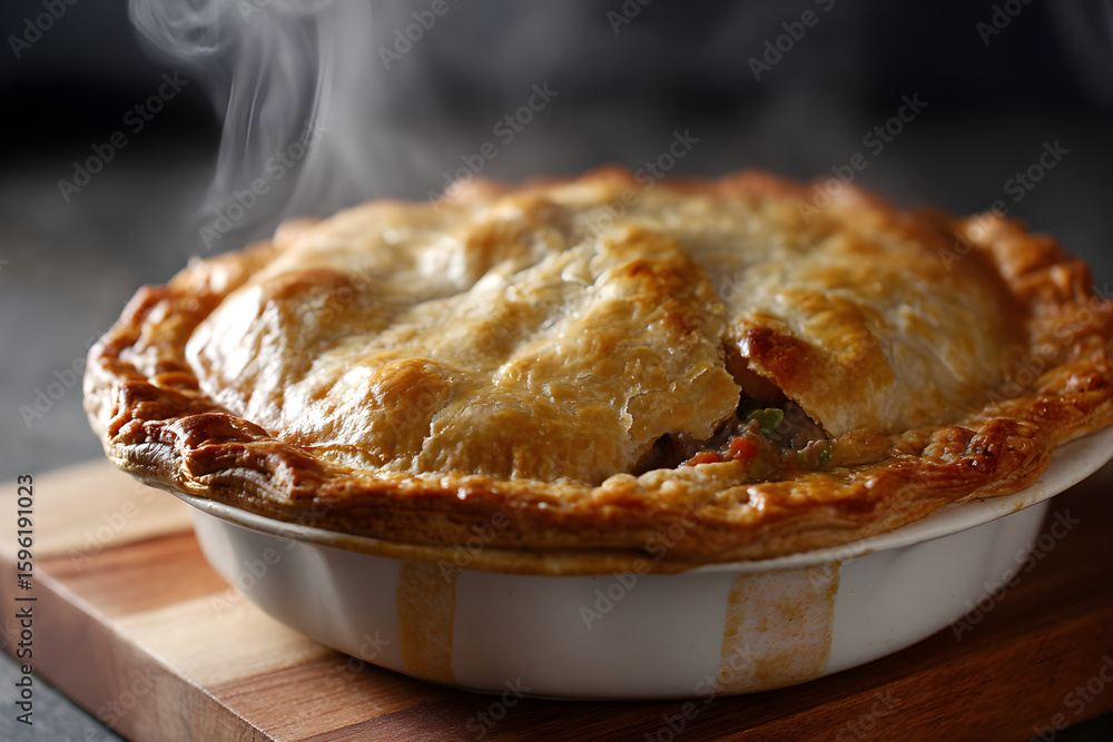 Fototapeta do Gabinetu Weterynaryjnego - Golden-brown steaming meat pie in a white ceramic dish, ready to be served #1596191023