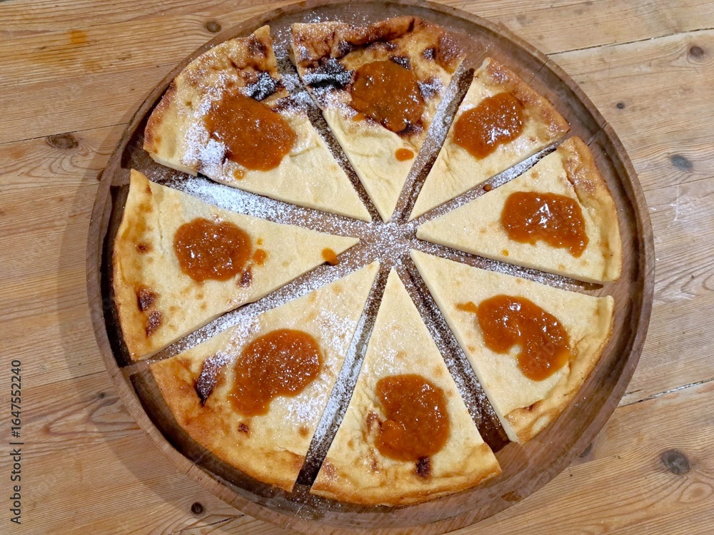 Fototapeta do Gabinetu Weterynaryjnego - Round milk pie sliced on a natural wooden table. #1647552240