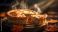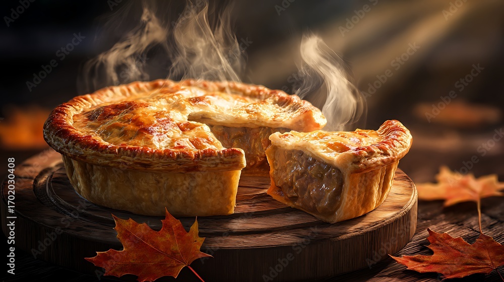 • A steaming hot pie with a slice removed on a wooden board surrounded by autumn leaves on a dark background