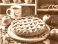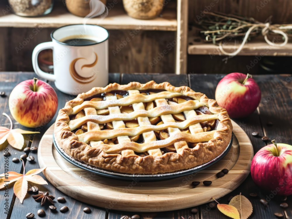 • Homemade apple pie with cinnamon on wooden board next to cup of coffee