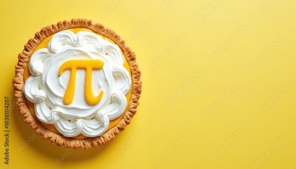 Fototapeta do Gabinetu Weterynaryjnego - Delicious pie with whipped cream and pi symbol on top sits on yellow background. Sweet baked... #1838104287