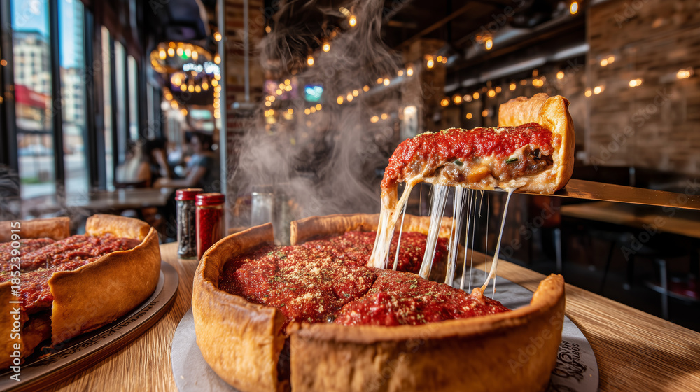 Fototapeta do Gabinetu Weterynaryjnego - Hot Chicago Deep Dish Pizza with Cheesy Slice Pull #1852390915