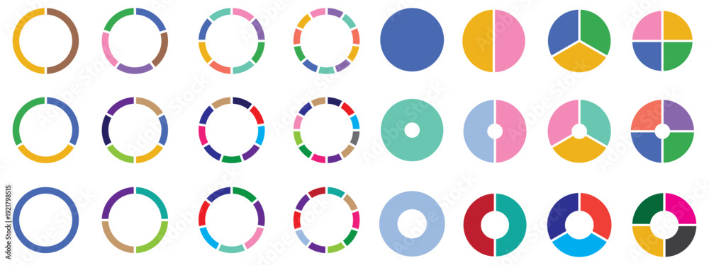 • Pie charts diagram set. Circle pie charts 1,2,3,4,5,6,7,8,9,10,11,12 sections. Wheel round segment infographic part. Circle section graph. Pie charts diagrams