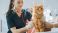 • Smiling Veterinarian Using Stethoscope to Examining Breathing of a Pet Maine Coon Sitting on a Check Up Table. Cat Owner Patiently Waiting in the Room to Calm the Red Cat. Visit to Veterinary Clinic