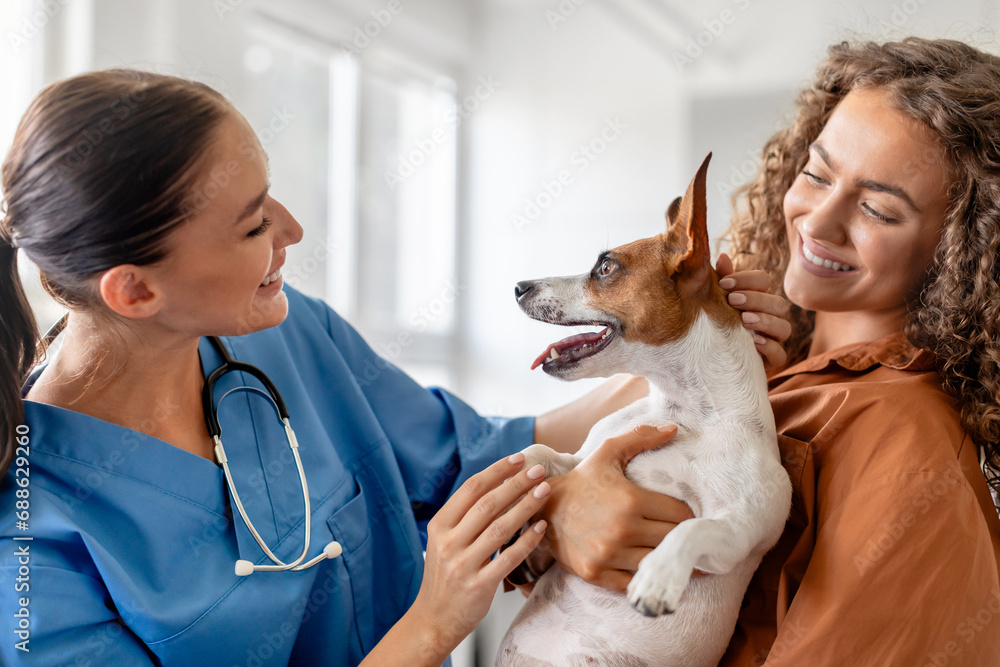Fototapeta do Gabinetu Weterynaryjnego - Two women and a dog at vet visit #688629260