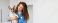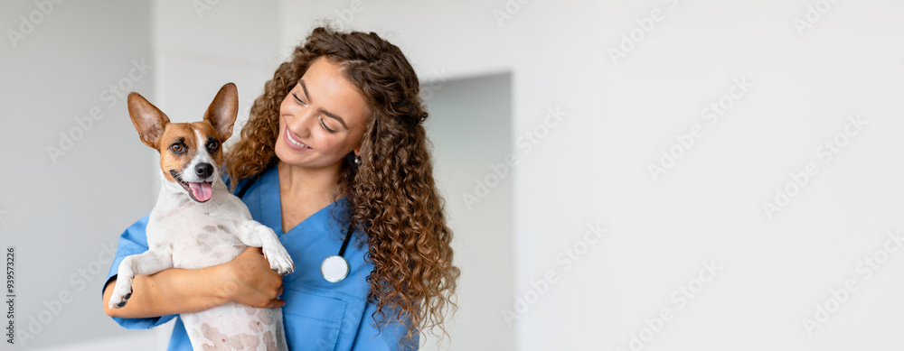 • Woman vet in blue uniform smiling as she holds small white and brown dog, providing professional care in a well-lit animal health clinic, copy space