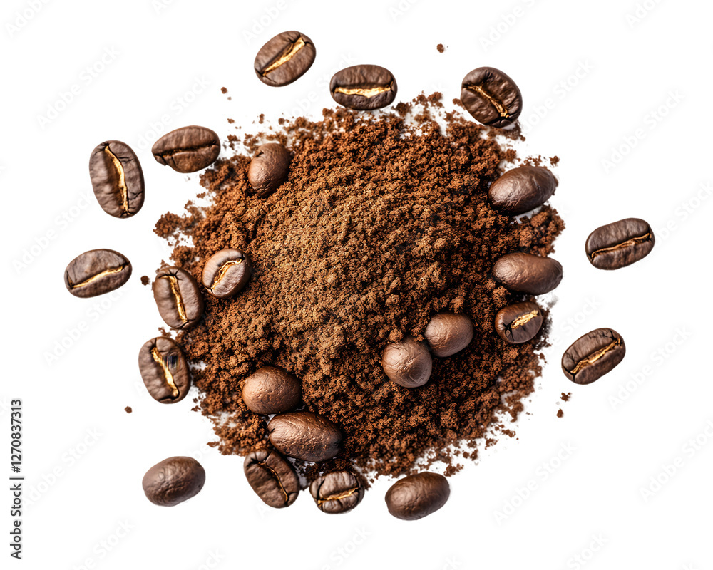 • Overhead close-up of dark brown coffee grounds surrounded by roasted coffee beans on a transparent background