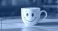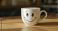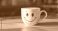 • A cheerful white coffee mug with a simple smiley face, sitting on a wooden table in the warm sunlight