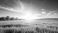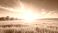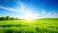 • Vibrant sunburst over emerald field of grass merging into clear blue sky
