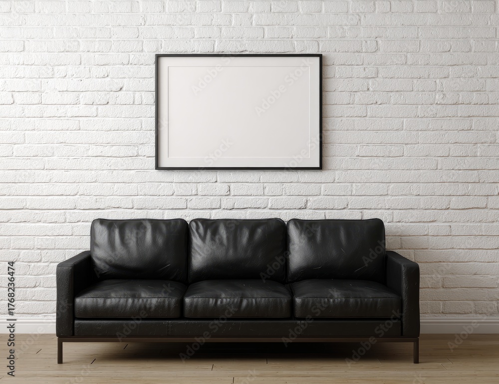 Fototapeta do Kuchni - A black leather sofa sits beneath a framed, empty rectangle on a white brick wall #1768236474