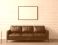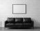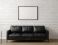 • A black leather sofa sits beneath a framed, empty rectangle on a white brick wall