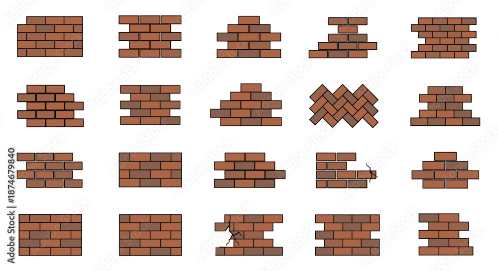 • Collection of diverse brick wall patterns and textures, including standard bricklaying, herringbone, and cracked sections, presented as flat vector illustrations on a clean white background, ideal