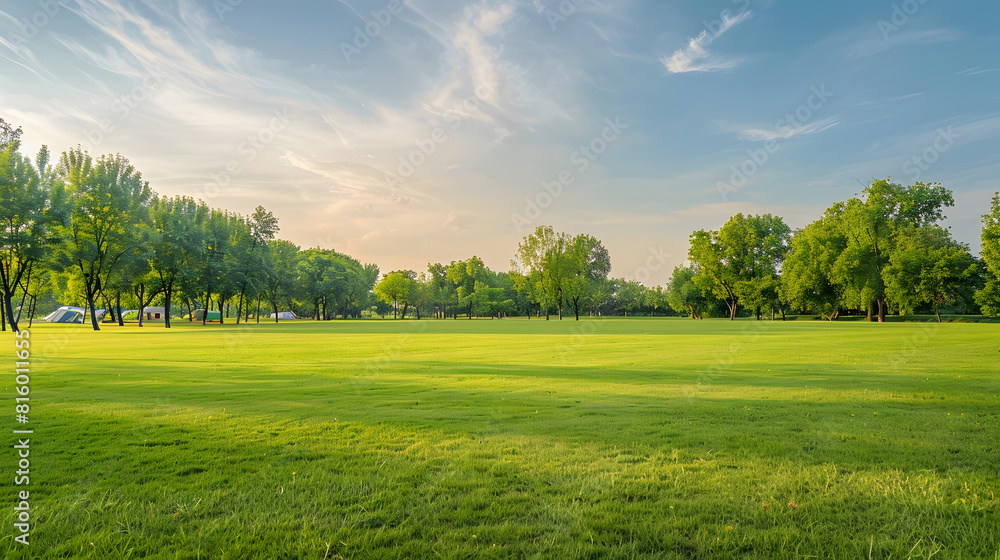 • Background texture of clean and wellmaintained grass lawn with a variety of trees in the background against beautiful sky Vacant ground or empty unpowered campsite in a park Copy space : Generative AI