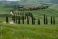 • Farma w Toskanii, Włochy, zielone wzgórza podczas zachodu słońca