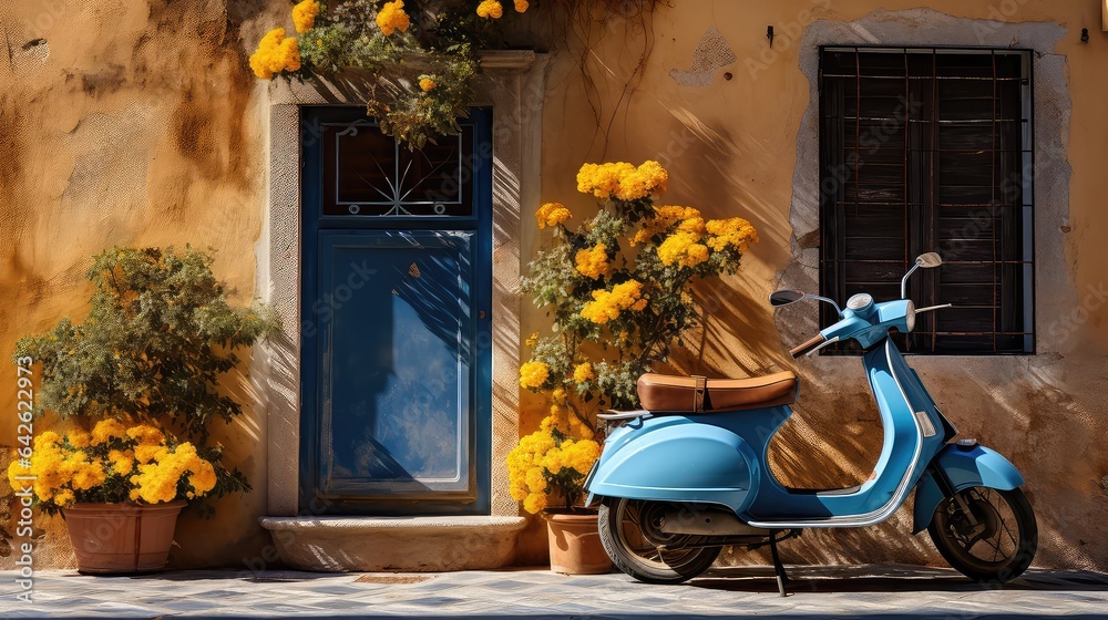 Fototapeta do Pizzerii - sztuka komputerowa przedstawiajaca klasyczny skuter na wluskiej uliczce, #642622973