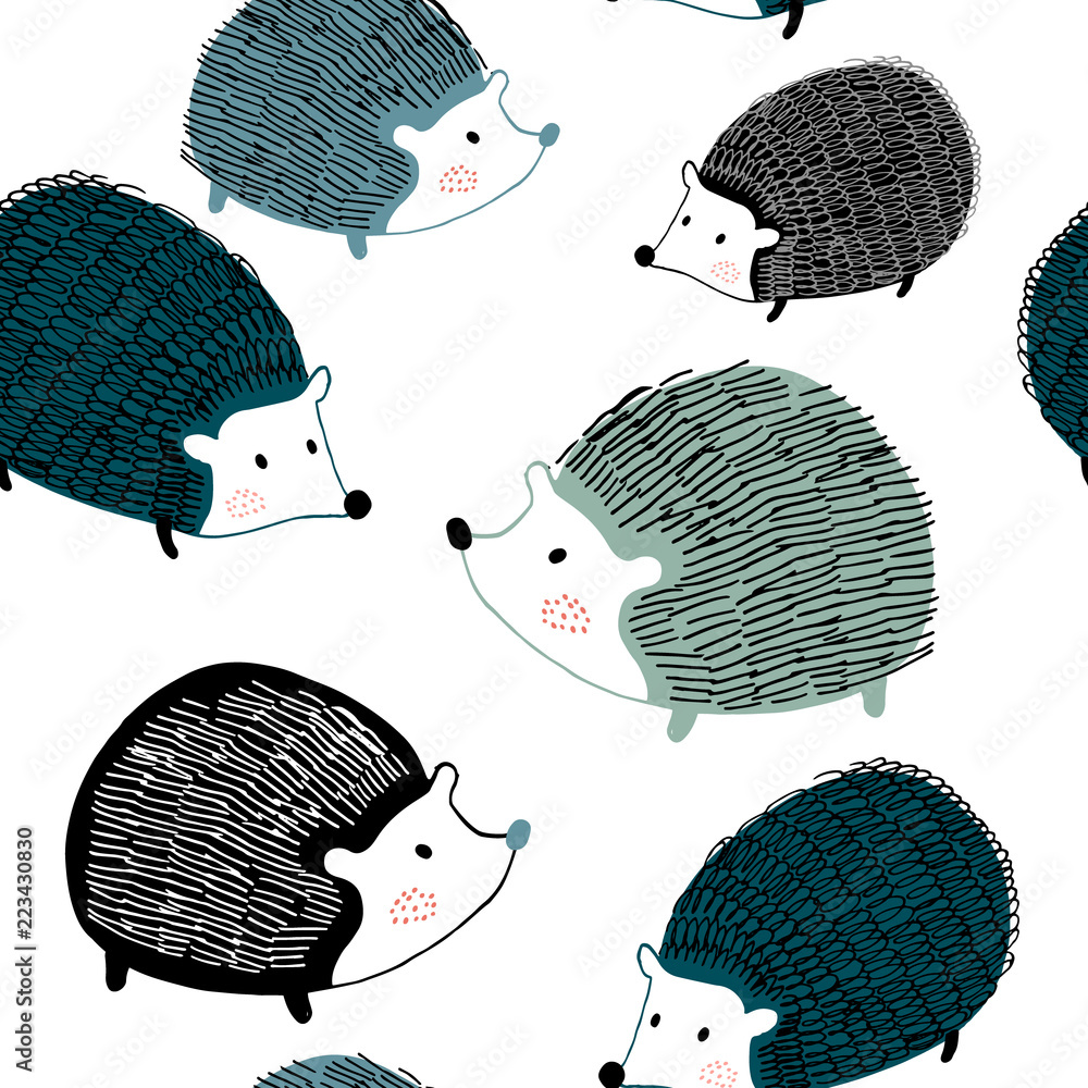 Fototapeta do Pokoju Dziewczynki - Seamless pattern with ink drawn hedgehogs. Creative scandinavian background. Perfect for kids... #223430830