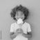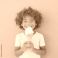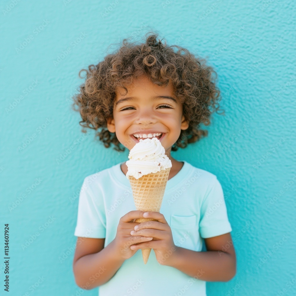 • Happy little kid eating an ice cream cone , smiling and holding it in his hands,