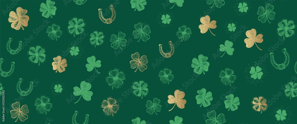 • Patricks Day, clover pattern on green. Hand drawn illustrations